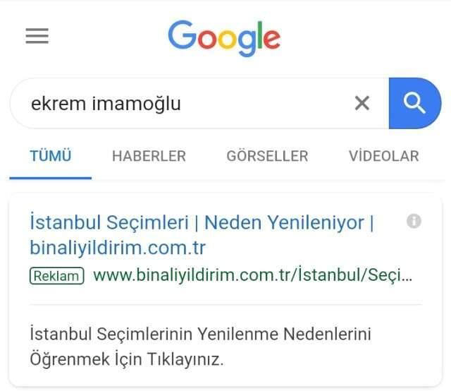 Google üzerindeki aramalarda kullanılan sözlerin satın alınarak yapıldığı bir reklam tipi olan Google Ads, ticari firmalar tarafından da kullanılıyor. Seçime sayılı günler kala Binali Yıldırım’ın kampanyasını yürüten takım tarafından hazırlanan Ads reklamında “Ekrem İmamoğlu” sözünü Google’da arayan vatandaşların karşısına Binali Yıldırım ismine açılan resmi web sitesi birinci sırada reklam başlığı ile çıkıyor.