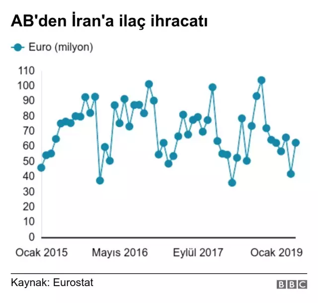 Yaptırımların yine konduğu geçen yılın Kasım ayından bu yana AB’den İran’a ilaç ve tıbbi materyal satışı evvel bir düşüş gösteriyor sonra bu yılın Mayıs ayında bir ölçü toparlanıyor.