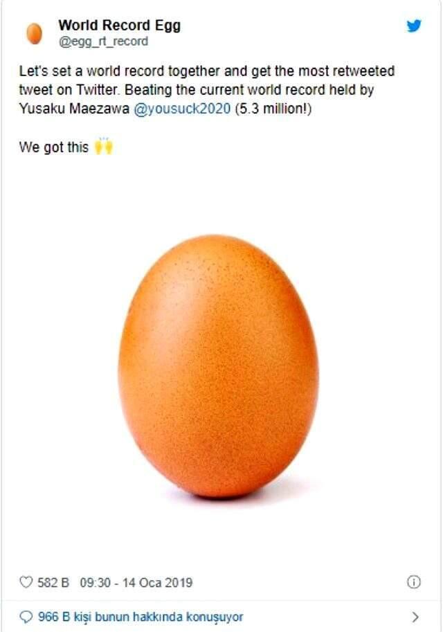 Twitter tarafından açıklanan birinci listede, en çok retweet edilen paylaşım 14 Ocak’ta ‘World Record Egg’ (@egg_rt_record) isimli hesaptan paylaşılan yumurta tweet’i oldu.