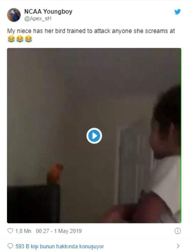 Beşinci sıradaysa, ‘NCAA Youngboy’ (@apex_sH)) isimli hesaptan 1 Mayıs’ta paylaşılan bir görüntü yer aldı. Minik bir kızın, bağırdığı şahıslara saldırması için eğittiği kuşunu gösteren görüntü 578 bin retweet aldı.